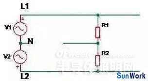 如上圖所示,V1 表示第一相電壓,V2表示第二相電壓,R1 及 R2 分別表示正常安裝到線路中的 LED 驅(qū)動器。當線路上零線(N)如圖斷開時,兩個支路上的驅(qū)動器 R1,R2 相當于串聯(lián)后接到 380Vac 電壓上。因為輸入內(nèi)阻差異,當其中一個驅(qū)動器充電到啟動時,內(nèi)阻變小,電壓可能大部分加到另外一個驅(qū)動器上,導(dǎo)致其過壓損壞失效。