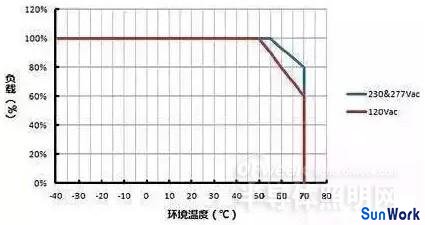 藍色曲線則表示 LED 驅(qū)動器在輸入 230Vac 或 277Vac 情況下,其負載隨環(huán)境溫度變化的功率降額曲線,其原理類同。